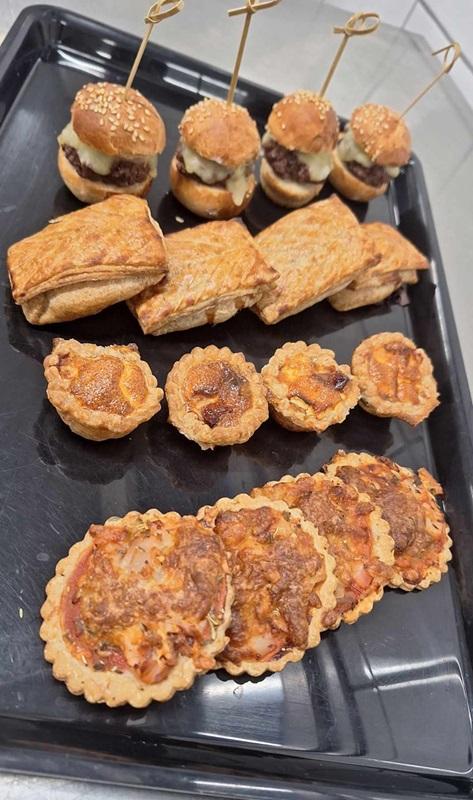 4 mini burger (pain (maison) *, steak haché*, tomme locale) / 4 mini pizza ( pâte brisée*, concentré de tomate, herbe de provence, jambon blanc, gruyère rapé) / 4 mini pâtés lorrains (pâte au saindoux, viande de porc, marinée au Gris de Toul, épices, pâte feuilletée*) 4 mini quiches : farine*,eau, sel, saindoux, lardons, crème, oeufs*