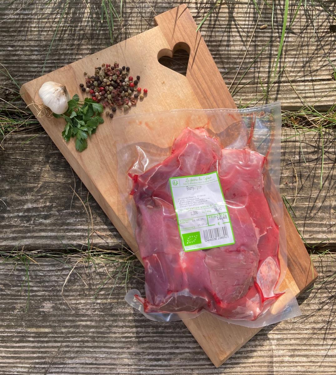 Viande à bourguignon, en dés, viande race limousine, agriculture biologique, mis sous-vide. Environ 0.600kg