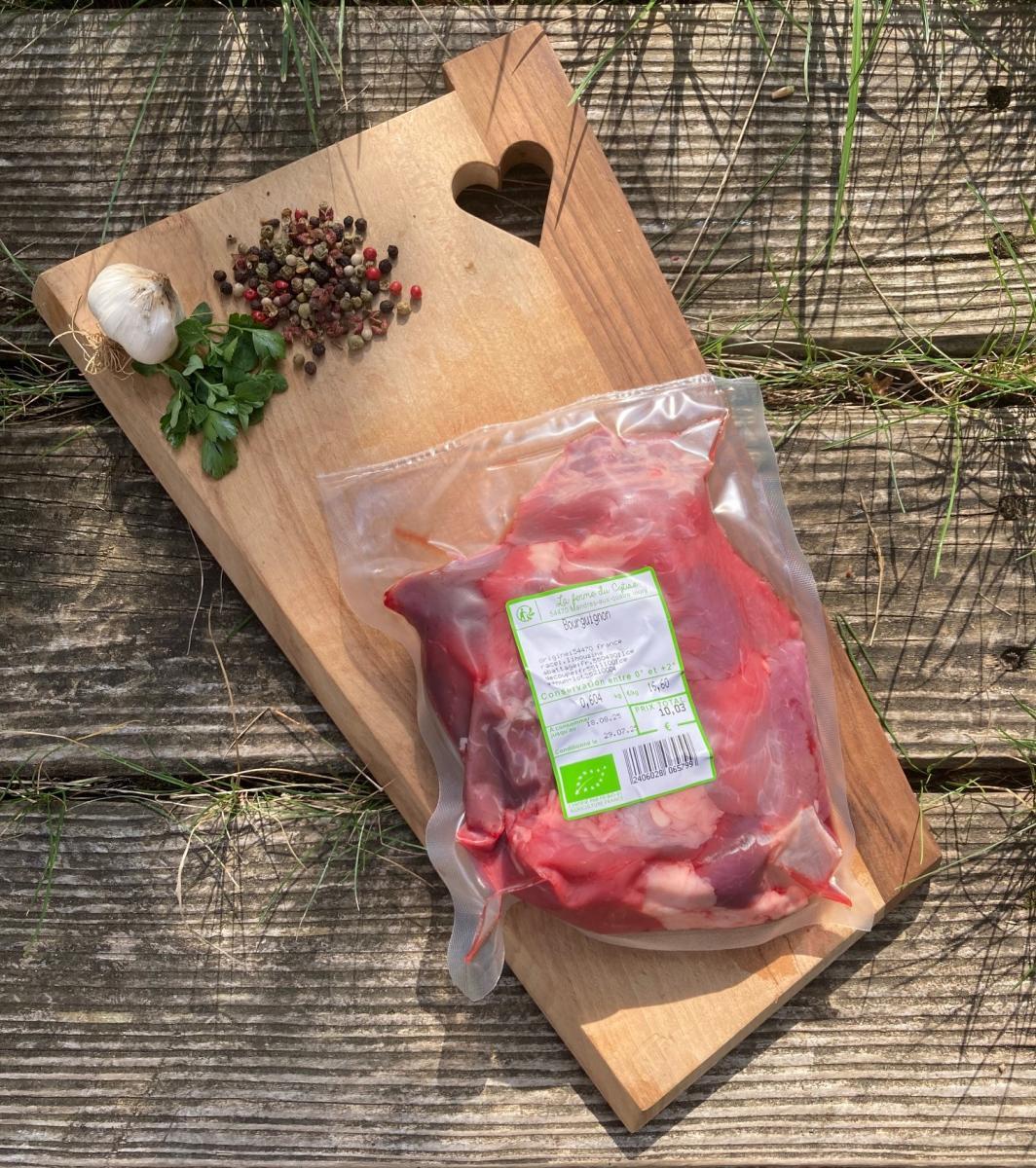 Viande à bourguignon, en dés, viande race limousine, agriculture biologique, mis sous-vide. Environ 600 g