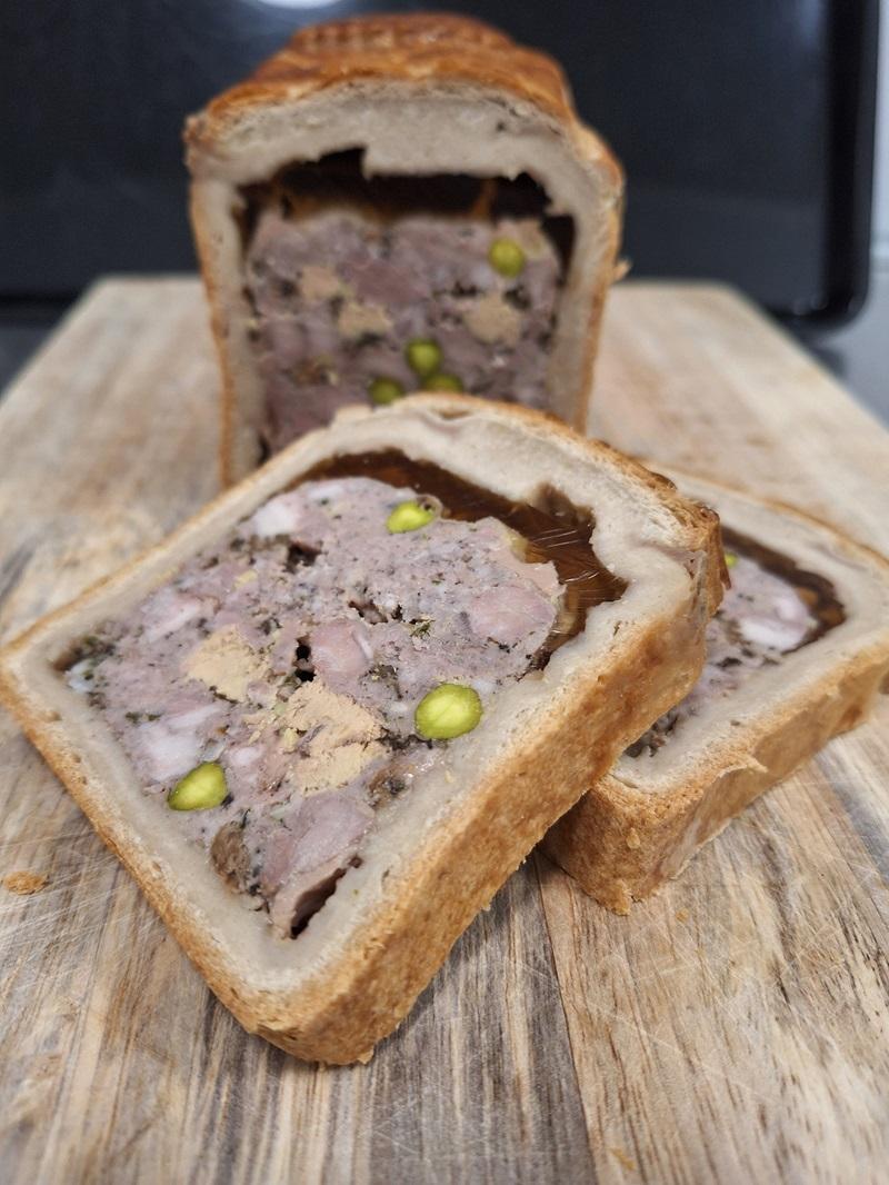 Pâte brisée maison au saindoux, viande à pâté mariné au Gris de Toul, avec du foie gras, morilles, et ses pistaches