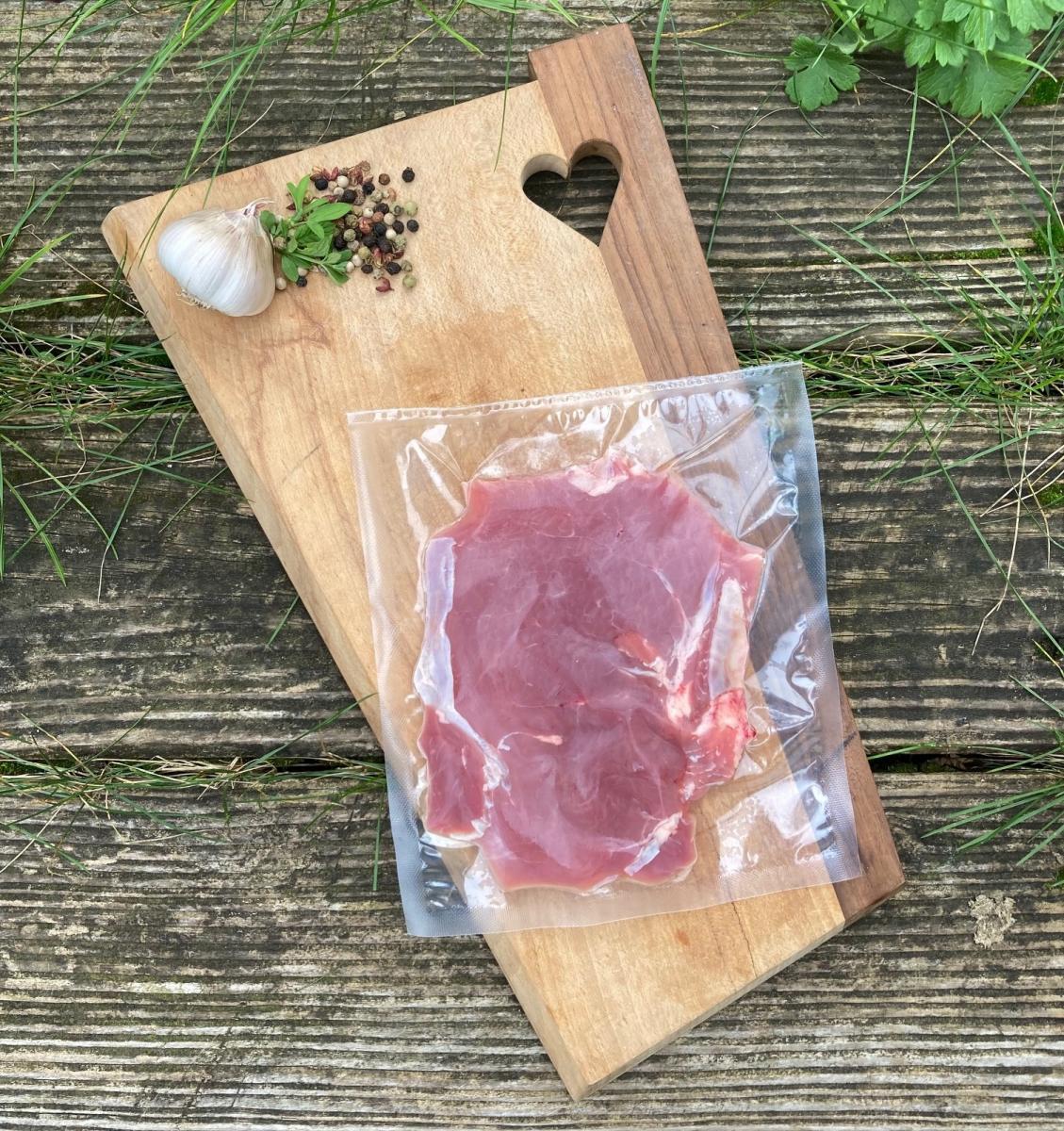 2 côtes de veau sans os (vers le faux filet), élevé sous la mère, agriculture biologique, mise sous-vide. Environ 300 grammes.