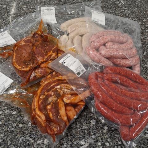 colis de 5kgs composé de : 1kg chipolatas ,1kg merguez de boeuf , 1kg côtes de porc marinées ,1 kg lard mariné et 1 kg saucisses blanches nature